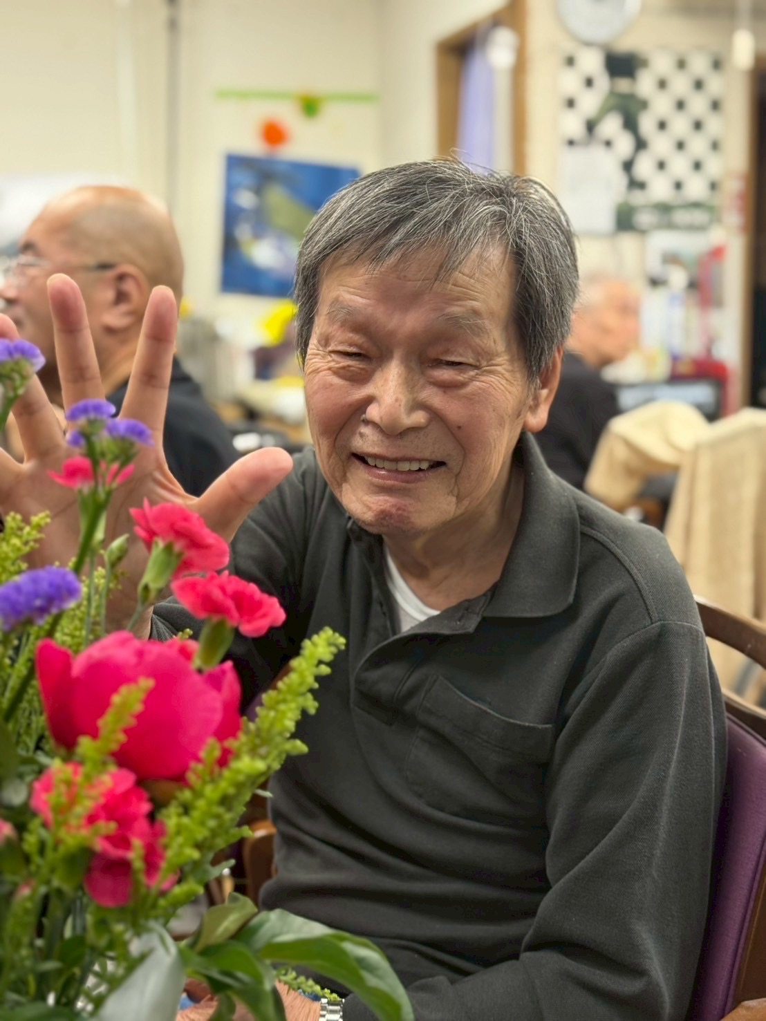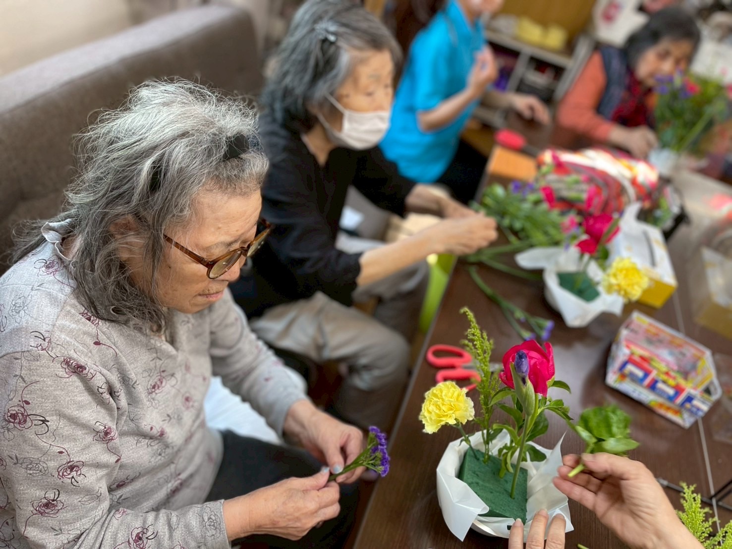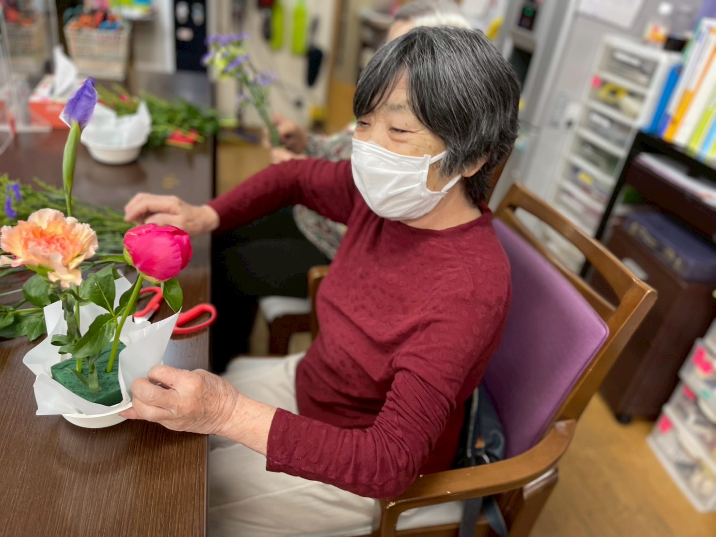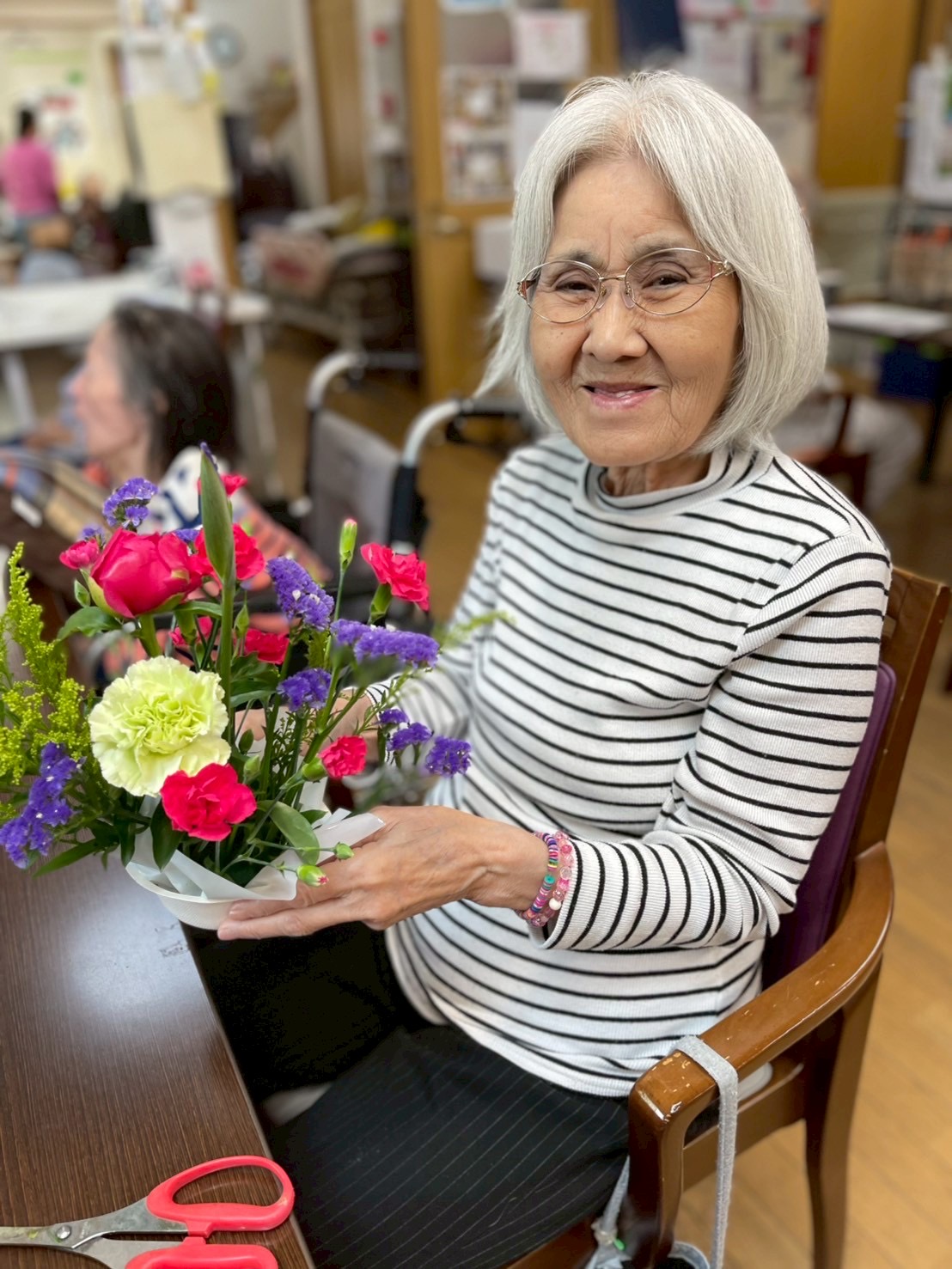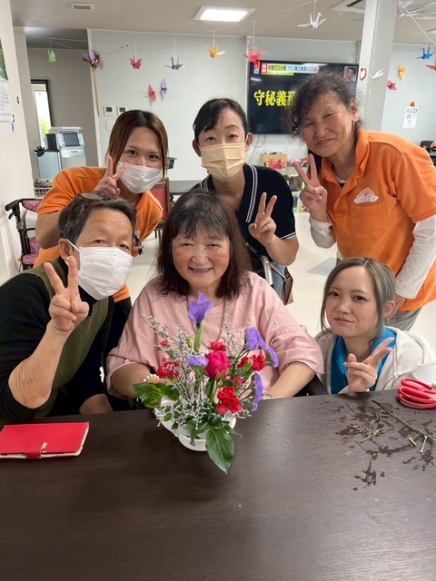令和7年5月フラワーアレンジメントレク 2025年12月09日 5月のフラワーアレンジメントも素敵な作品が沢山出来上がりました♪♪ 季節の花が毎月飾られるので、とっても施設やお部屋が華やかになります(*'▽') イベントブログ一覧はこちら